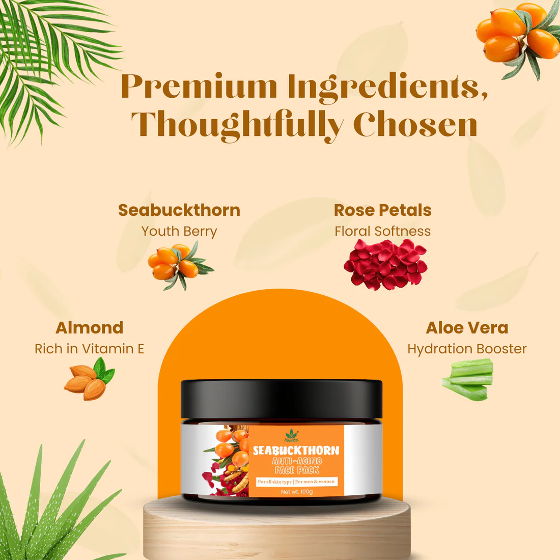 Havintha’s Seabuckthorn Anti-Aging Face Pack is a herbal blend designed to restore youthful vitality and natural glow. Enriched with plant-based and Ayurvedic ingredients, it reduces signs of aging, improves skin tone, and enhances overall texture. The formula gently cleanses impurities, tightens pores, and boosts hydration—leaving your skin soft, fresh, and rejuvenated. Regular application supports firmer, radiant skin without harsh chemicals.